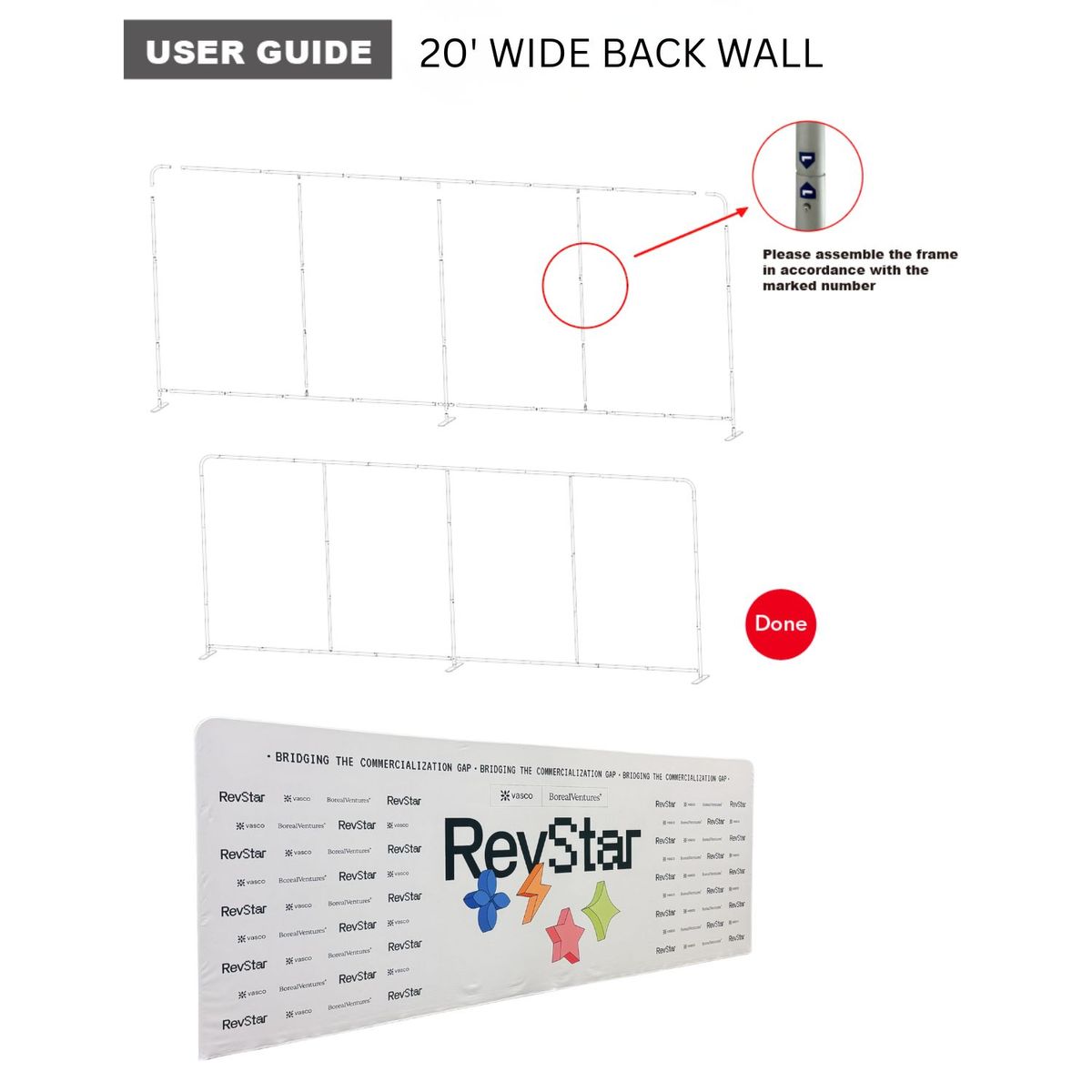 - This LARGER 20' wide display wall is approx 96" tall. It Includes Hardware and Graphics. Lightweight aluminum frame.