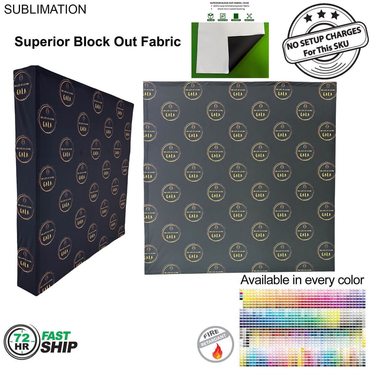 - Our superior block out fabric wall with black backing is perfect for bright, sun-filled spaces. The specialized material stops light from penetrating the fabric, ensuring vivid graphics and full privacy. The look of this Straight wall is very clean, no ruffles in the fabric. The sublimated tension fabric wall stays flushed on the hardware for the perfect photo background and the 12" depth of the wall makes it very sturdy. It transforms from a compact unit to an impressive backdrop wall in minutes. Superior Block Out Fabric 7.9oz. 100% warp-knitted polyester fabric. black resin coating back. This fabric wall is Dye sublimated. You can get the background in every pantone PMS color with full color graphics, Step and Repeat design, photos, graduation messge, etc. Graphic panel covers the front and sides of the pop-up Wall.