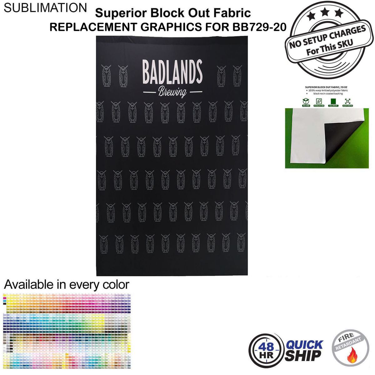 - Replacement graphics will work for our sku # BB729-20 Display, Media Wall, Superior Block out fabric Backdrop. Artwork is sublimated on Superior Block Out polyester fabric which provides opacity and doesn't allow light to pass through making your graphics pop. Its a high-quality material which is durable. Available in every pantone PMS color and with Unlimited Graphics possibilities to create your unique display, Media wall, Backdrop. Dye-sublimation printing delivers vivid graphics. Step and Repeat Graphics are a popular choice for this item.
